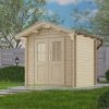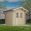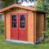 – Fußboden (optional) aus massiven 19-mm-Holzdielen mit Nut u. Feder, aus Nordeuropäischer Fichte, mit ausgefälzten, ringsum geschlossenen Fundamentrahmen.