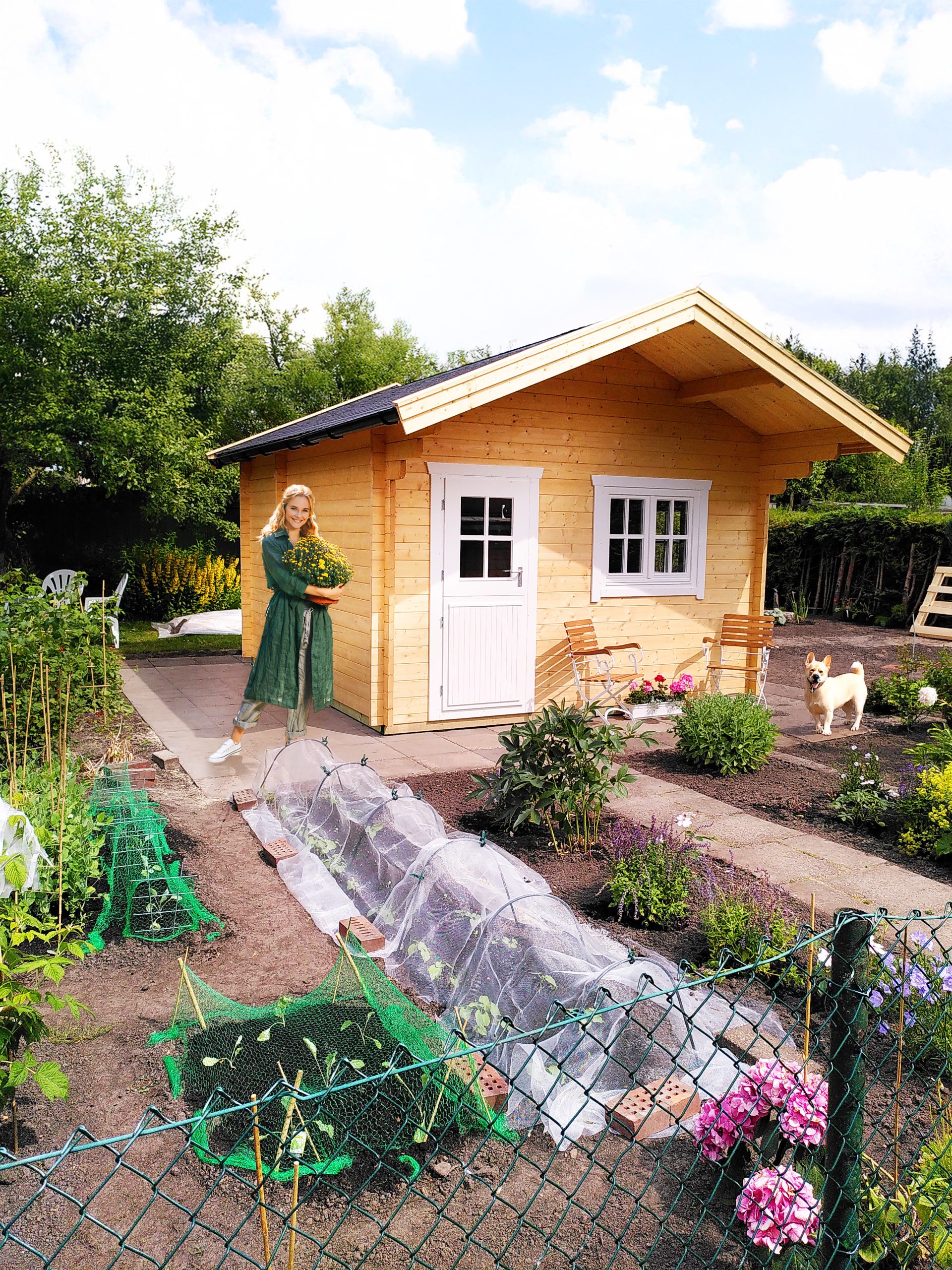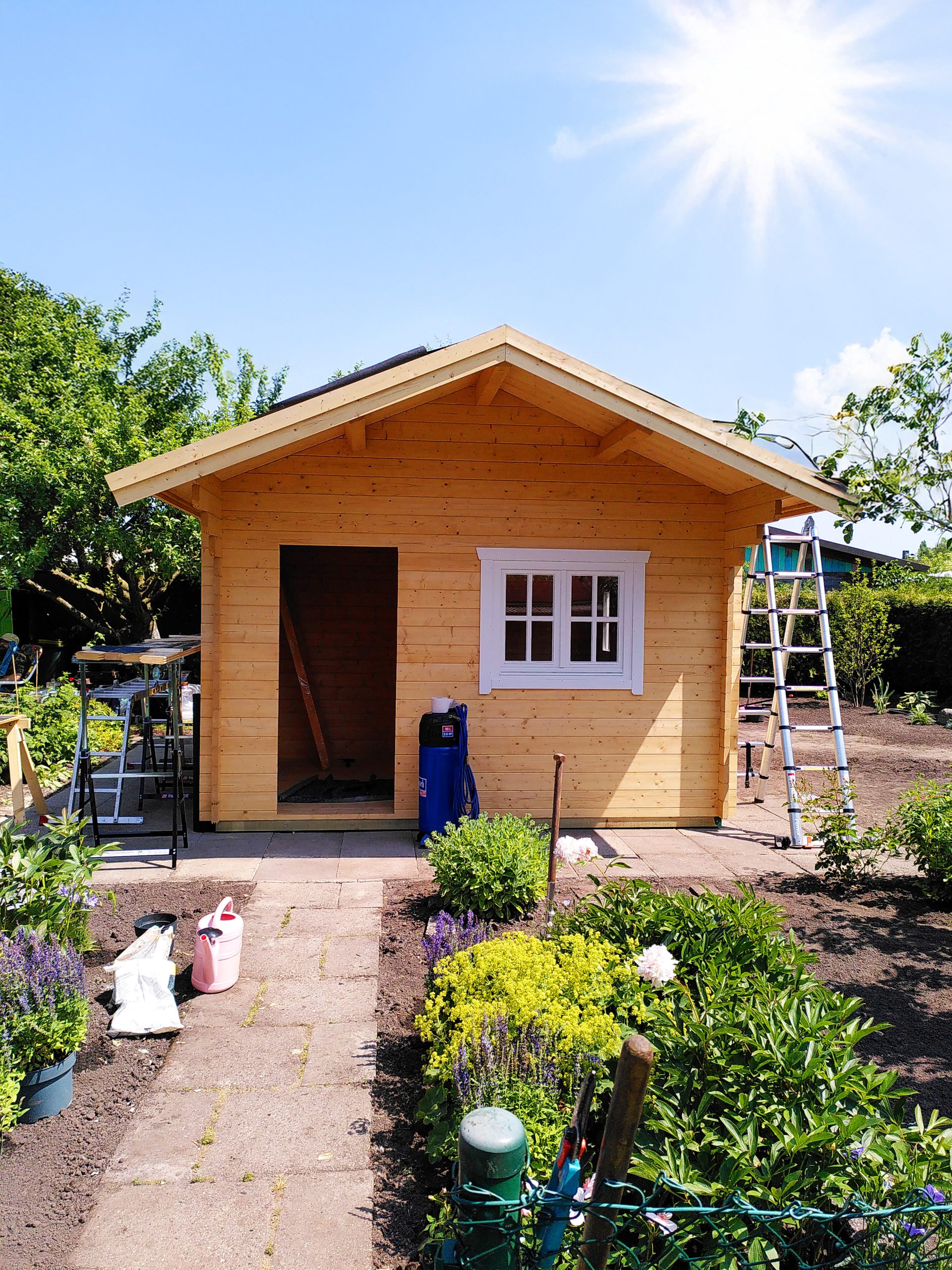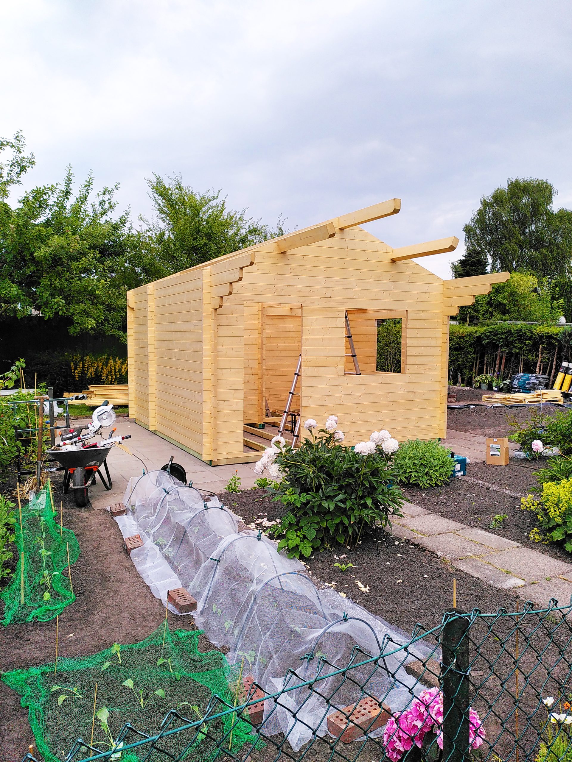 Ein Gartenhaus mit größerem Unterstand bietet praktischen Stauraum und zusätzlichen, wettergeschützten Platz im Außenbereich.