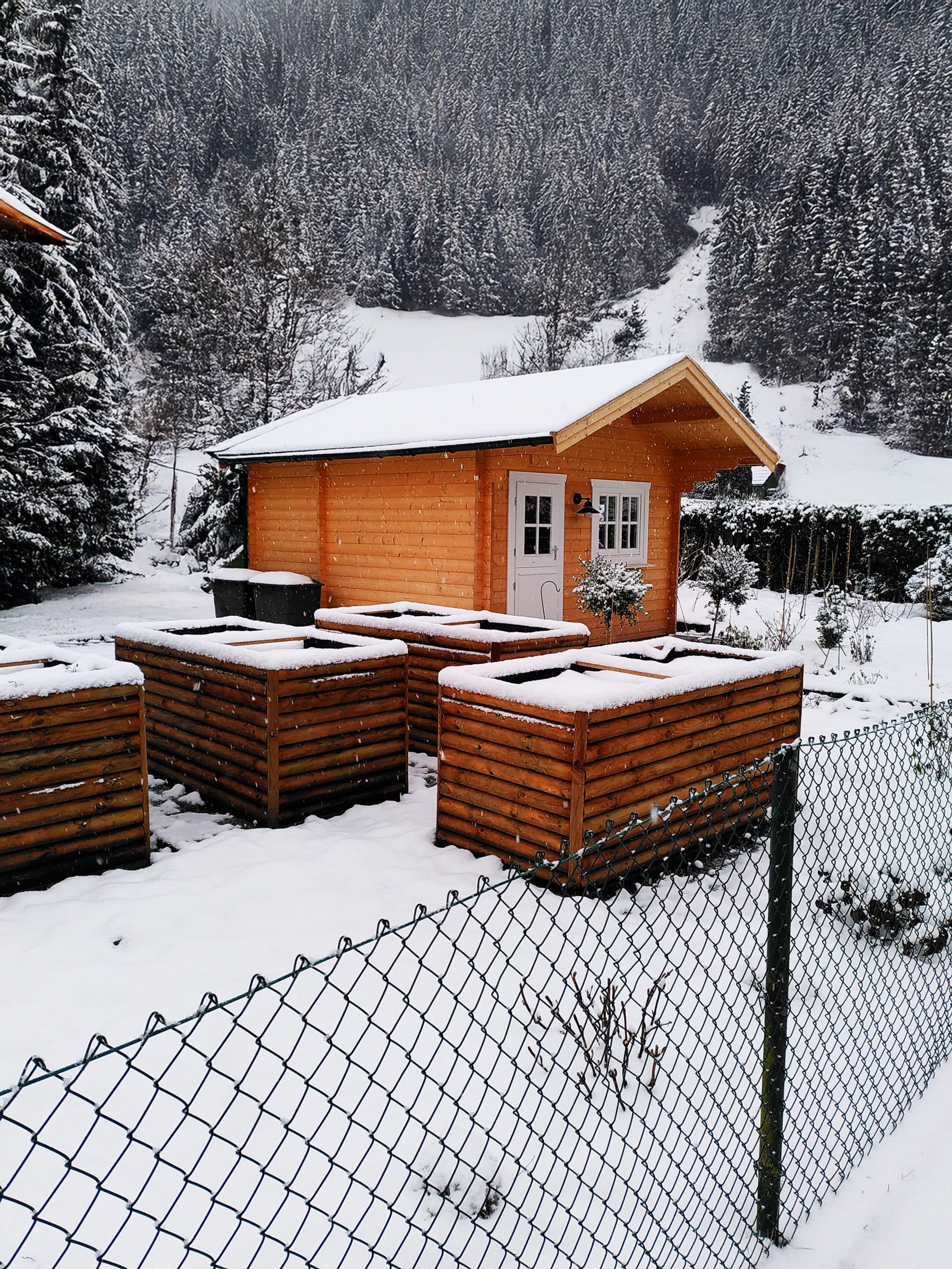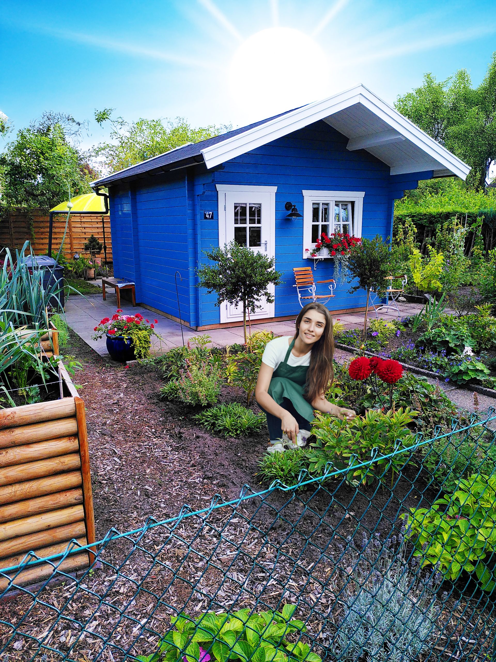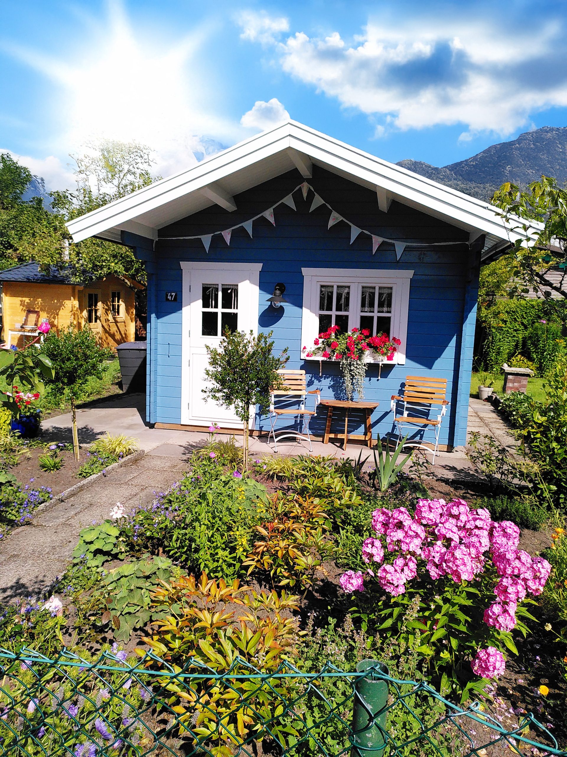 Ein Gartenhaus mit größerem Unterstand bietet praktischen Stauraum und zusätzlichen, wettergeschützten Platz im Außenbereich.