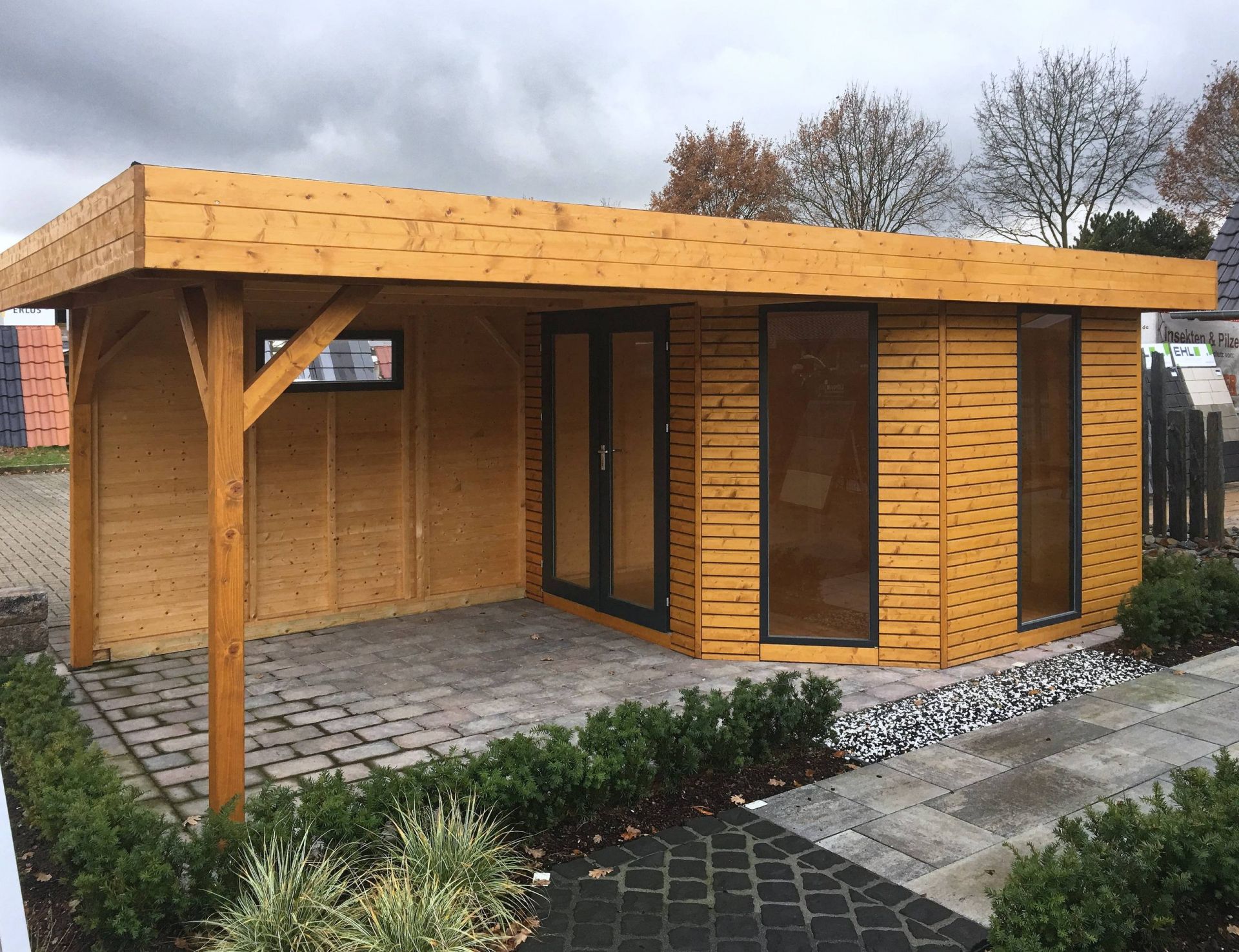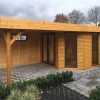 In der Modulbauweise (oft auch Elementbauweise genannt) lässt sich ein Gartenhaus mit Flachdach und großem Überstand besonders zeitsparend und flexibel realisieren. Im Gegensatz zur schichtweisen Blockbohlenbauweise werden hier komplette Wandelemente verwendet, was eine hochmoderne Architektur mit klaren Linien und großen Glasflächen begünstigt.