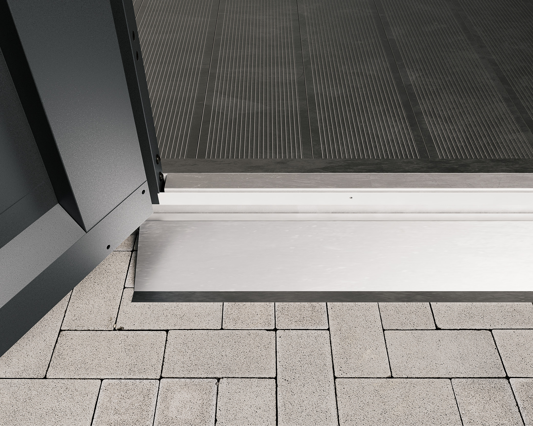 Stabile Bodenschwellenrampe für leichtes Ein- und Ausfahren von Geräten im Geräteschuppen. Rutschfest, robust und einfach zu montieren.