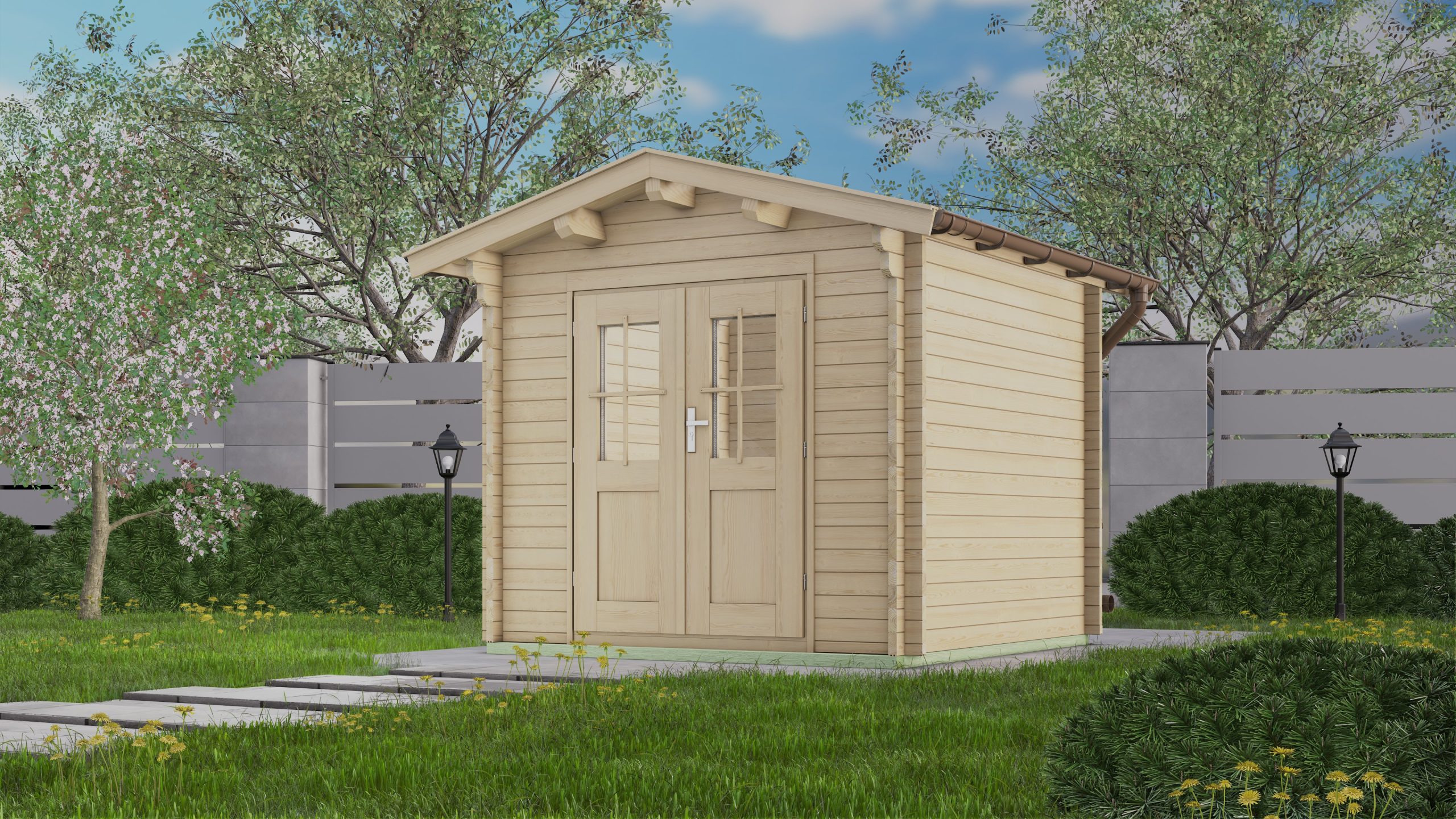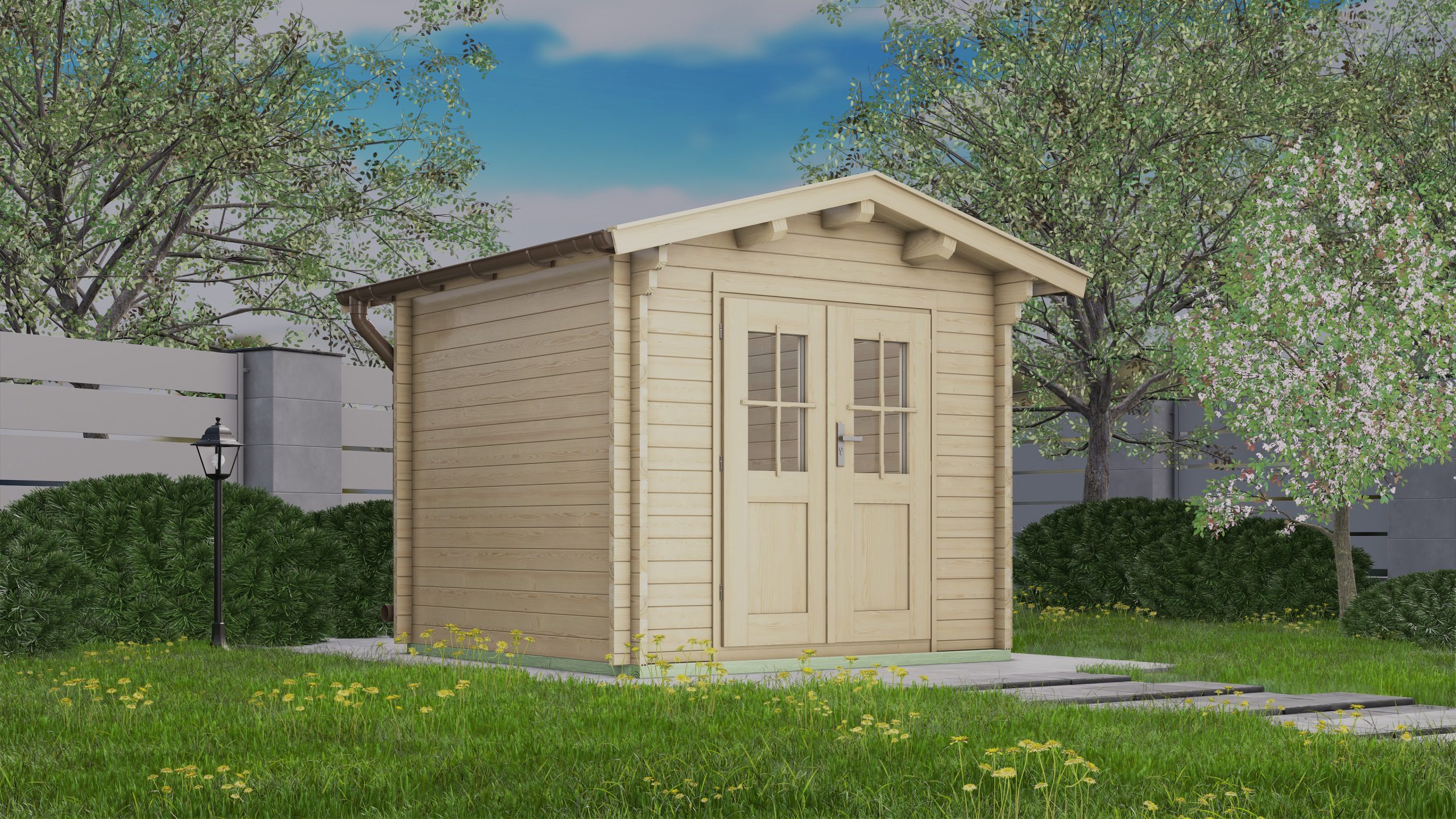 – Fußboden (optional) aus massiven 19-mm-Holzdielen mit Nut u. Feder, aus Nordeuropäischer Fichte, mit ausgefälzten, ringsum geschlossenen Fundamentrahmen.
